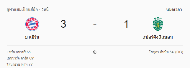 – นาทีที่ 94 Laimer โดนใบเหลืองจากฟาวล์ใส่ Mangas - นาทีที่ 95: จบเกม! บาเยิร์น มิวนิก 3-1 สปอร์ติ้ง ลิสบอน พลิกแซงสุดมันในครึ่งหลัง