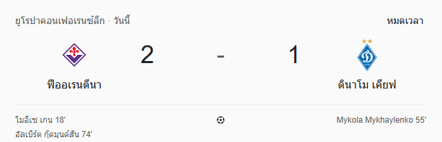 - นาทีที่ 96: จบเกม ฟิออเรนตินา เฉือนชนะ ดินาโม เคียฟ 2-1