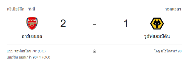 - นาทีที่ 99: หมดเวลา อาร์เซนอลเปิดบ้านเฉือนชนะ วูล์ฟแฮมป์ตัน 2-1