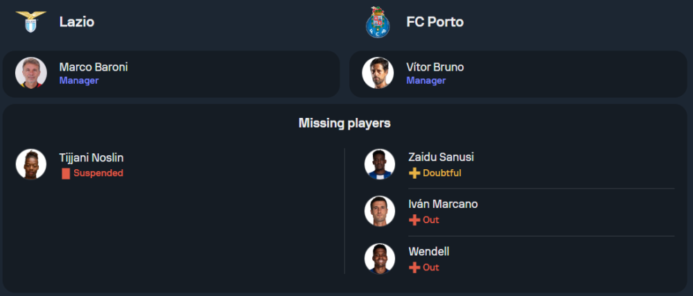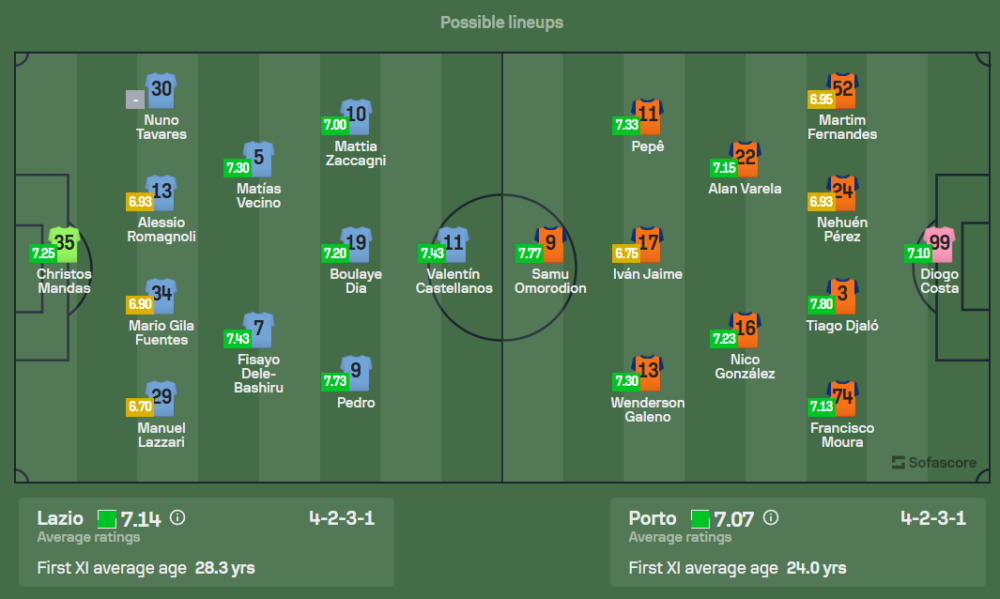 ปอร์โต้: วิตอร์ บรูโน่ กุนซือปอร์โต้เจอกับปัญหาผู้เล่นเจ็บหลายราย ทั้ง ไซดู ซานูซี่, เวนเดลล์ และ อิบัน มาร์กาโน่ ในแผงหลัง รวมถึง มาร์โก กรูยิช กองกลางที่ยังไม่หายเจ็บ แต่ยังมีตัวเลือกที่แข็งแกร่งพอที่จะลงสนาม แผงหลังของปอร์โต้ในเกมนี้จะนำโดย มาร์ติม แฟร์นานเดส, นาฮูเอน เปเรซ, ติอาโก ยาโล่ และ ฟรานซิสโก้ มูร่า ส่วนแดนกลางจะใช้ อลัน วาเรล่า, นิโก กอนซาเลซ และ อิบัน ไฆเม ในการคุมเกม ส่วนหน้าเป้าตัวทีเด็ดที่ปอร์โต้คาดหวัง ซามู โอโมโรเดียน ที่ทำประตูในยูโรปาลีกไปแล้ว 4 ลูกจาก 3 นัดที่ผ่านมา จะเป็นตัวรุกที่สำคัญอีกครั้ง