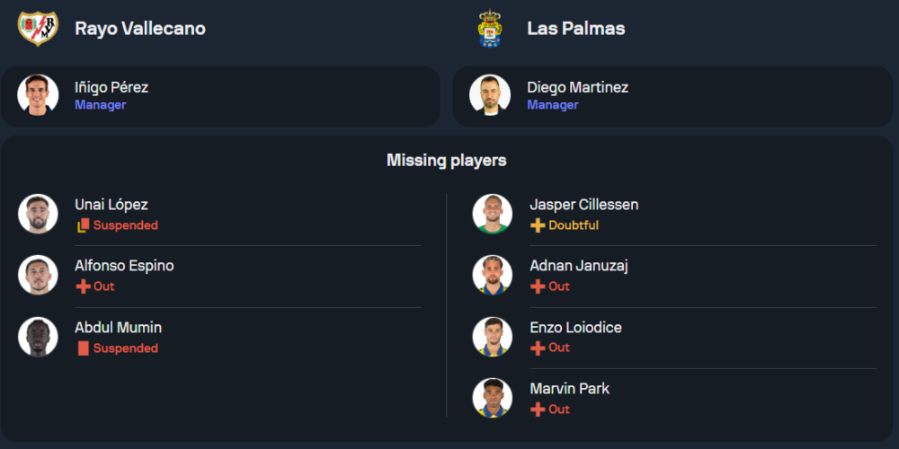 ทีมเจ้าบ้าน ราโย่ บาเยกาโน่ ภายใต้การคุมทีมของ อินญิโก้ เปเรซ ต้องเจอปัญหานักเตะโดนแบนหลายรายในเกมนี้ โดย อับดุล มูมิน ถูกแบนจากใบแดง ส่วน อูไน โลเปซ กองกลางตัวหลักก็จะพลาดการลงสนามเนื่องจากสะสมใบเหลืองครบ อย่างไรก็ตามพวกเขายังมีตัวเลือกสำรองที่พร้อมทดแทน เช่น อาริดาเน่ เอร์นานเดซ และ เกราร์ด กุมบาอู ในขณะที่เกมรุกยังคงวางใจให้ อิซี่ ปาลาซอน และ เซร์คิโอ กาเมโย่ ที่ทำผลงานดีอย่างต่อเนื่อง