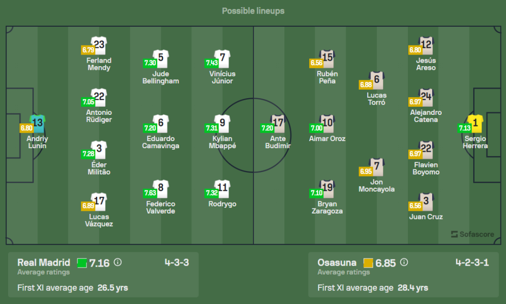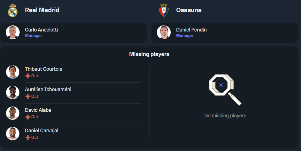 คาร์โล อันเชล็อตติ กุนซือของเรอัล มาดริด กำลังเผชิญกับปัญหาผู้เล่นบาดเจ็บสำคัญหลายราย โดยเฉพาะ โอเรเลียง ชูอาเมนี่ ที่เจ็บข้อเท้าจากเกมแชมเปี้ยนส์ลีกพ่ายให้กับเอซี มิลาน คาดว่าจะต้องพักราว 1 เดือน ขณะที่ ติโบต์ กูร์กตัวส์, ดาวิด อลาบา และ ดานี่ การ์บาฆาล ก็ยังไม่พร้อมลงสนาม อย่างไรก็ตาม พวกเขายังมีข่าวดีเมื่อ เฟเดริโก้ วัลเวร์เด้ ฟิตทันช่วยแดนกลาง ร่วมกับ เอดูอาร์โด้ กามาวินก้า และ จู๊ด เบลลิงแฮม ส่วนในแนวรุก คาดว่าจะใช้ โรดรีโก้, คีลิยัน เอ็มบัปเป้ และ วินิซิอุส จูเนียร์ เป็นสามประสานที่พร้อมถล่มประตูในระบบ 4-3-3