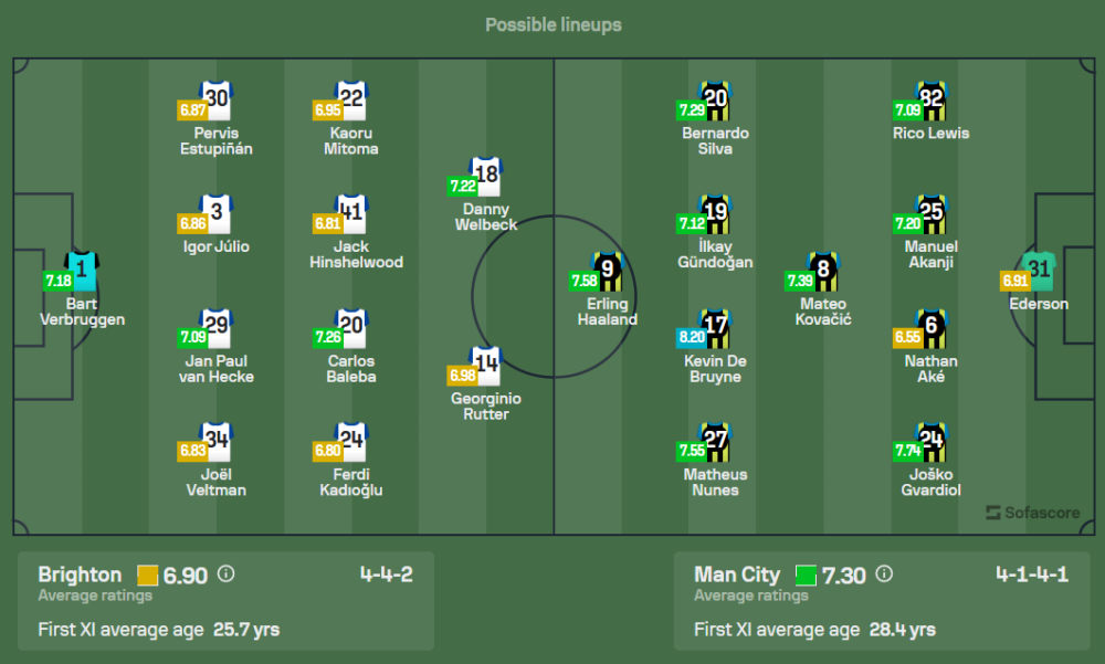 หากดูจากสถิติการเจอกันที่ผ่านมา แมนเชสเตอร์ ซิตี้ ทำผลงานได้เหนือกว่ามาก ในการพบกัน 10 นัดหลังสุด ไบรท์ตันเอาชนะไปได้เพียง 1 นัด เสมอ 1 นัด และแพ้ถึง 8 นัด โดยเฉพาะเกมล่าสุดที่ทั้งคู่พบกันนั้น ไบรท์ตันเปิดบ้านพ่ายเละ 0-4 สถิติเหล่านี้ชี้ให้เห็นถึงความยากลำบากของไบรท์ตันในการเผชิญหน้ากับแชมป์เก่า