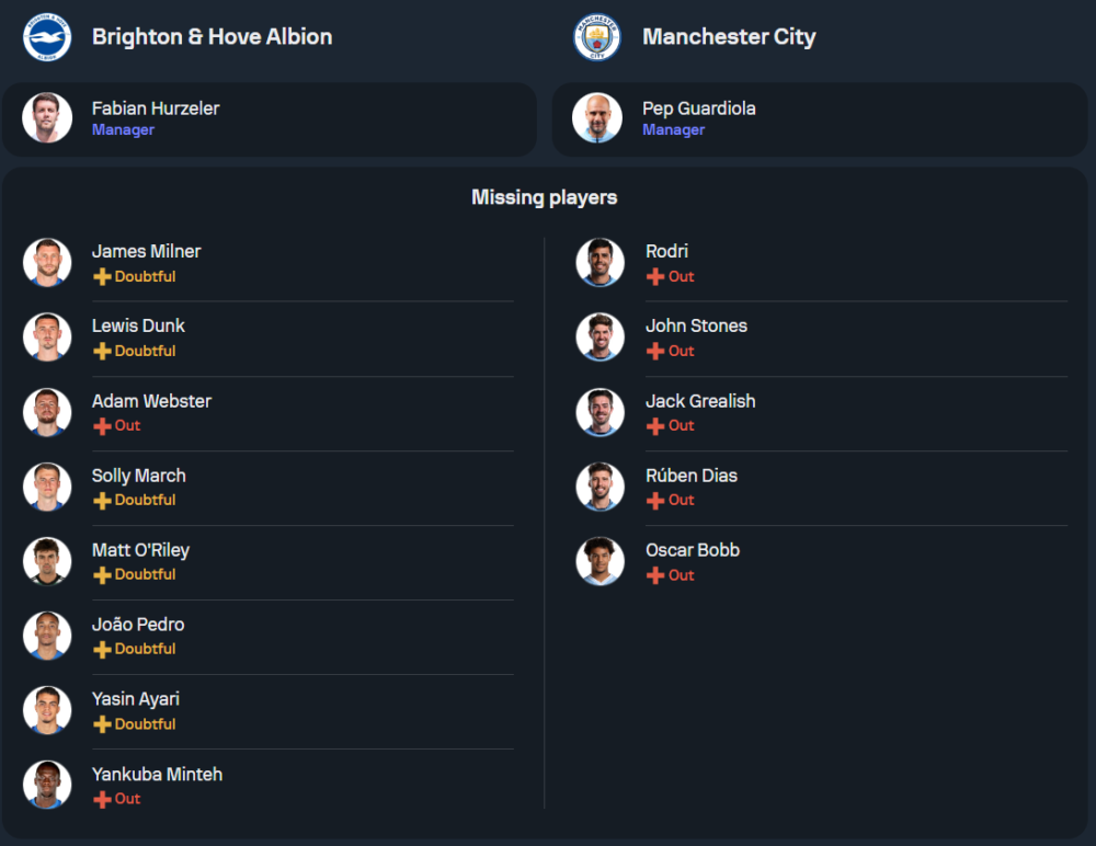 ฝั่งของ เป๊ป กวาร์ดิโอล่า นายใหญ่ของแมนเชสเตอร์ ซิตี้ ยังคงมีปัญหาเรื่องผู้เล่นบาดเจ็บ โดยเฉพาะ เควิน เดอ บรอยน์ ที่เพิ่งกลับมาฟิตและลงเล่นในฐานะตัวสำรองในเกมล่าสุด ขณะที่ จอห์น สโตนส์ และ รูเบน ดิอาส ยังต้องเช็กความฟิต ด้าน แจ็ค กรีลิช และ โรดรี้ เอร์นานเดซ ยังไม่พร้อมลงสนาม การจัดทัพคาดว่าจะใช้ผู้เล่นสำรองบางราย โดยมี ไคล์ วอล์คเกอร์, นาธาน อาเก้ และ อิลคาย กุนโดอัน เป็นแกนหลักในแนวรับ ส่วนเกมรุกจะมี ซาวินโญ่, ฟิล โฟเด้น และ เฌเรมี่ โดกู คอยปั้นเกมเพื่อสนับสนุนหน้าเป้า เออร์ลิง ฮาลันด์