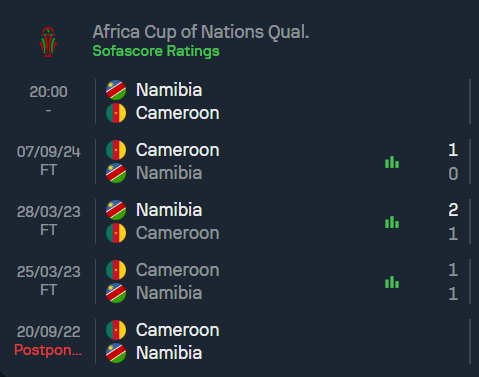 หากย้อนดูสถิติการเจอกันของทั้งสองทีม ผลงานที่ผ่านมาเรียกได้ว่าสูสีกันอย่างมาก โดย นามิเบีย เคยชนะเพียง 1 เกม เสมอ 1 เกม และแพ้ 1 เกมให้กับ แคเมอรูน นัดล่าสุดที่เจอกันนั้นเป็นการเปิดบ้านของ แคเมอรูน และพวกเขาก็สามารถเอาชนะไปได้ด้วยสกอร์ 1-0 ทำให้ครั้งนี้เจ้าบ้านต้องการแก้ตัวและสร้างผลงานให้แฟนบอลได้เห็น