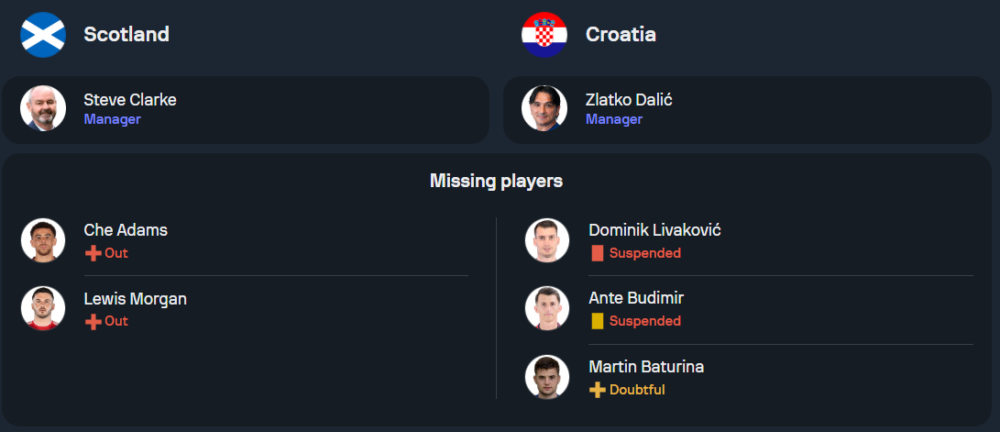 ซลัทโก้ ดาลิช นายใหญ่ของโครเอเชียต้องปรับเปลี่ยนทีมเช่นกัน เนื่องจากขาดผู้เล่นตัวหลักสองคนคือ โดมินิค ลิวาโควิช ผู้รักษาประตูมือหนึ่งจากเฟเนร์บาห์เช่ และ อันเต้ บูดิเมียร์ กองหน้าจากโอซาซูน่า ที่ติดโทษแบนทั้งคู่ เกมนี้ เนดิลิโก้ ลาโบรวิช จากเอ๊าก์สบวร์ก จะได้ลงเฝ้าเสาแทน ส่วนตัวรุกยังคงใช้บริการของ อังเดร คามาริช และ มาร์ติน บาตูริน่า ในการสร้างสรรค์เกมรุก หน้าเป้าเป็น อิกอร์ มาตาโนวิช ที่จะเป็นความหวังในการล่าประตู