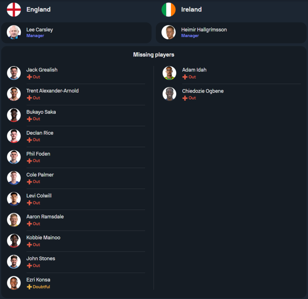 ทีมชาติอังกฤษ ภายใต้การคุมทีมของ ลี คาร์สลี่ย์ กุนซือรักษาการที่จะลงทำหน้าที่นัดสุดท้ายก่อนจะส่งต่อให้ โธมัส ทูเคิ่ล ที่จะมาคุมทีมถาวร สภาพทีมตอนนี้มีปัญหาในแนวรับ เนื่องจาก เอซรี่ คอนซ่า บาดเจ็บจากเกมที่เอาชนะกรีซ นอกจากนี้ จาร์แร็ด แบรนธ์เวต ก็ถอนตัวไปอีก ทำให้เหลือเพียง มาร์ค เกฮี เป็นเซนเตอร์แบ็กหลัก โดยคู่หูในแนวรับอาจต้องเลือกใช้งานระหว่าง เทย์เลอร์ ฮาร์วู้ด-เบลลิส หรือ จาเรลล์ ควอนซาห์ ในส่วนของแนวรุก แฮร์รี่ เคน พร้อมกลับมาลงสนามเต็มที่ ร่วมกับ จาร์ร็อด โบเว่น, มอร์แกน โรเจอร์ส, และ อังเจล โกเมส คาดว่าจะจัดทัพมาในระบบ 4-2-3-1 โดยให้ แฮร์รี่ เคน ยืนเป็นหน้าเป้าหลัก