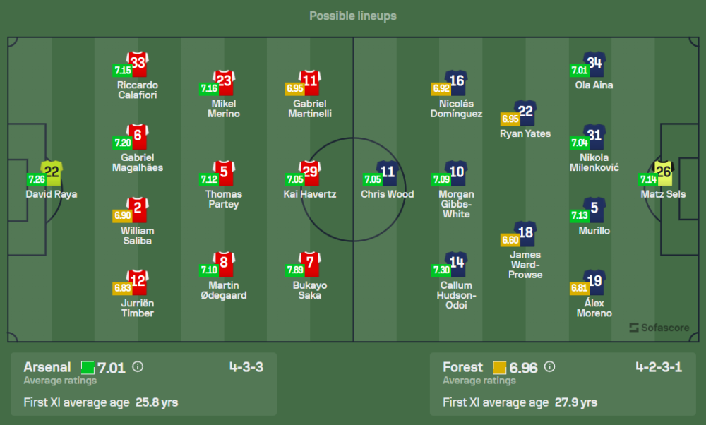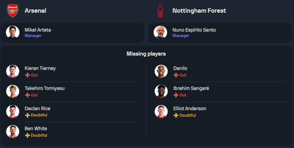 กุนซือ มิเกล อาร์เตตา ยังคงเจอปัญหาเรื่องผู้เล่นบาดเจ็บ โดยเกมนี้จะขาด เบน ไวท์, คีแรน เทียร์นีย์, ริคคาร์โด คาลาฟิออรี และ ทาเกฮิโระ โทมิยาซุ ส่วนผู้เล่นตัวหลักอย่าง บูกาโย่ ซาก้า, เลอันโดร ทรอสซาร์ด และ ดีแคลน ไรซ์ ยังต้องรอเช็คความฟิต คาดว่าจะจัดทัพในระบบ 4-3-3 โดยมี มาร์ติน โอเดการ์ด, ดีแคลน ไรซ์ และ มิเกล เมริโน่ คุมเกมแดนกลาง พร้อมแนวรุกที่นำโดย ไค ฮาแวร์ตซ์, บูกาโย่ ซาก้า และ กาเบรียล มาร์ติเนลลี่