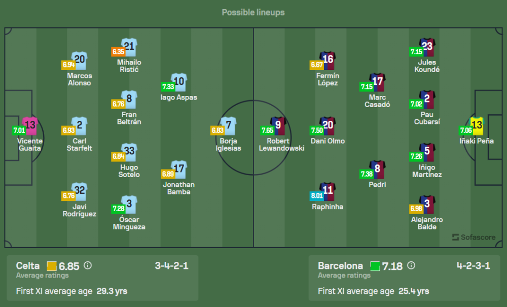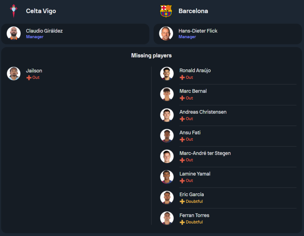 ฮันส์-ดีเตอร์ ฟลิค เฮดโค้ชของทีมเจอปัญหาใหญ่เมื่อ มาร์ก อันเดร แตร์ สเตเก้น มือกาวคนสำคัญปิดฉากฤดูกาลนี้ไปแล้ว เช่นเดียวกับนักเตะอย่าง โรนัลด์ อาเราโฆ่, เอริค การ์เซีย, อันเดรียส คริสเตนเซ่น และ เฟร์ราน ตอร์เรส ที่ยังไม่พร้อมลงสนาม ส่วน ลามิน ยามาล และ โรเบิร์ต เลวานดอฟสกี้ ยังต้องลุ้นเช็คความฟิต คาดว่าจะใช้ระบบ 4-2-3-1 โดยมี เปดรี้, ราฟินญ่า และ ดานี่ โอลโม่ คอยสนับสนุน เลวานดอฟสกี้ หากพร้อมลงล่าตาข่าย
