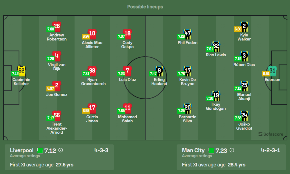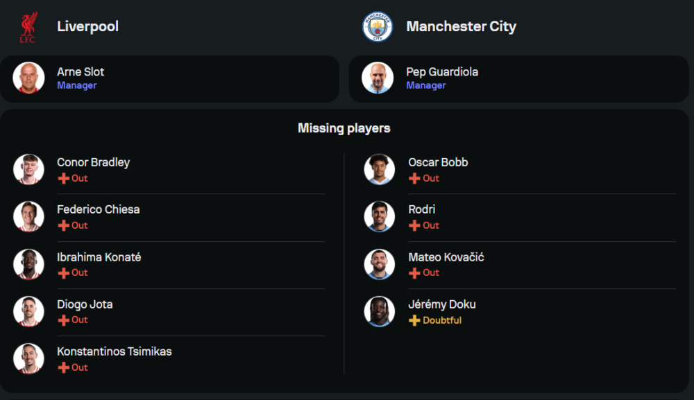 “เรือใบสีฟ้า” ของเป๊ป กวาร์ดิโอล่า เผชิญปัญหานักเตะหลักบาดเจ็บเช่นกัน ทั้งโรดรี้, จอห์น สโตนส์ และมัตเตโอ โควาซิช แต่อาวุธสำคัญอย่าง เออร์ลิ่ง ฮาแลนด์ ยังพร้อมลุย โดยเป๊ปคาดว่าจะปรับแผนมาสู้ด้วยระบบ 4-2-3-1 เพื่อเพิ่มความแน่นอนในเกมรับ