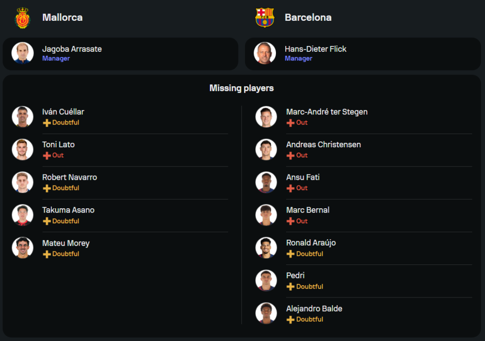 จาโกบา อาร์ราซาเต้ เฮดโค้ชของมายอร์ก้า ต้องพบกับปัญหาผู้เล่นบาดเจ็บหลายรายเช่นเดิม ไม่ว่าจะเป็น โทนี่ ลาโต้, อีบัน กูเอยาร์, โกเปเต้ และ ทาคุมะ อาซาโนะ อย่างไรก็ตาม ทีมจะได้ตัว เวดัต มูริชี่ กลับมาลงสนามหลังพ้นโทษแบน ทำให้แนวรุกมีมิติและความน่ากลัวเพิ่มขึ้น โดยคาดว่าทีมจะใช้ระบบ 4-2-3-1 ซึ่งมี มูริชี่ ยืนเป็นหน้าเป้าตัวหลัก พร้อมกับ โรเบิร์ต นาบาร์โร่ และ เซร์จี้ ดาร์เดร์ คอยสนับสนุนจากแดนกลาง
