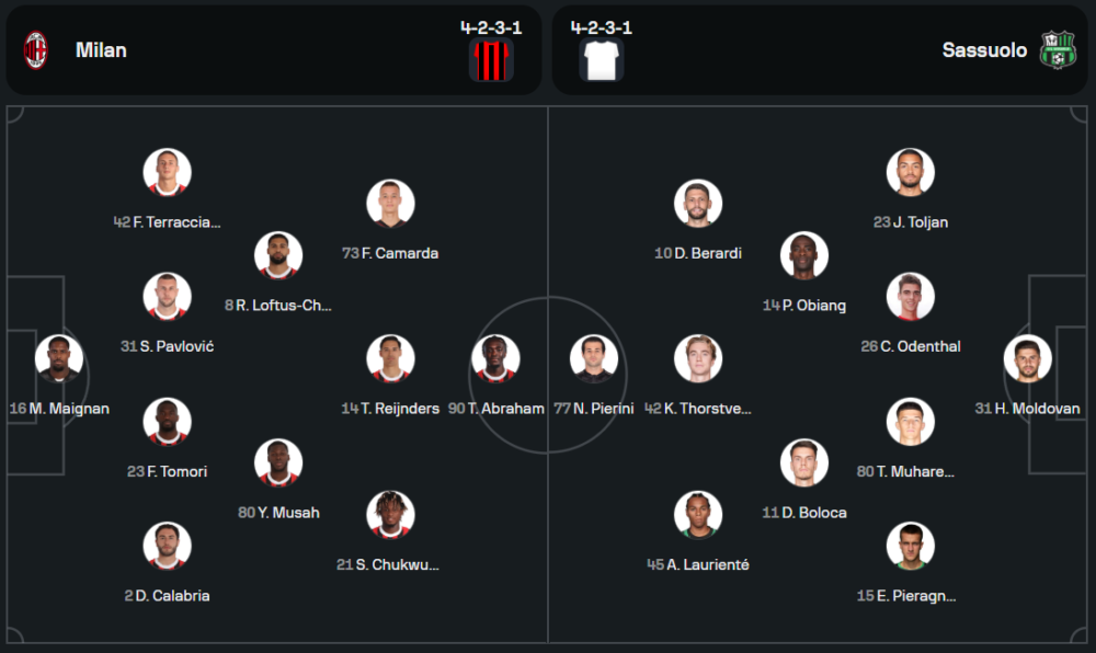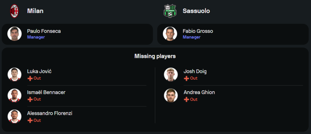 เปาโล ฟอนเซก้า กุนซือของมิลาน เตรียมโรเตชั่นทีมบางตำแหน่งเพื่อรับมือกับโปรแกรมที่อัดแน่น โดยแนวรุกยังคงฝากความหวังไว้ที่ แทมมี่ เอบราแฮม และ ซามูเอล ชุควูเอเซ่ รวมถึง โนอาห์ โอคาฟอร์ ที่จะช่วยกันล่าตาข่าย ส่วนผู้เล่นสำคัญอย่าง อิสมาแอล เบนนาเซอร์ และ ลูก้า โยวิช ยังไม่พร้อมลงสนาม คาดว่ามิลานจะมาในระบบ 4-3-3 ที่เน้นเกมรุกเต็มพิกัด