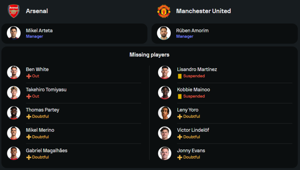 มิเกล อาร์เตต้า เตรียมทีมลงสนามด้วยความมั่นใจ หลังจากเก็บชัยชนะ 3 นัดรวด ยิงรวมถึง 13 ประตู และไม่มีรายงานนักเตะเจ็บเพิ่ม นอกจาก ทาเคฮิโระ โตมิยาสุ และ เบ็น ไวท์ ที่ยังต้องพักฟื้น การจัดทีมคาดว่าจะใช้ระบบ 4-3-3 โดยมี บูกาโย่ ซาก้า, ไค ฮาเวิร์ตซ์ และ กาเบรียล มาร์ตินเนลลี่ เป็นตัวรุกในแดนหน้า พร้อมจอมทัพอย่าง ดีแคลน ไรซ์ คอยขับเคลื่อนเกมจากแดนกลาง