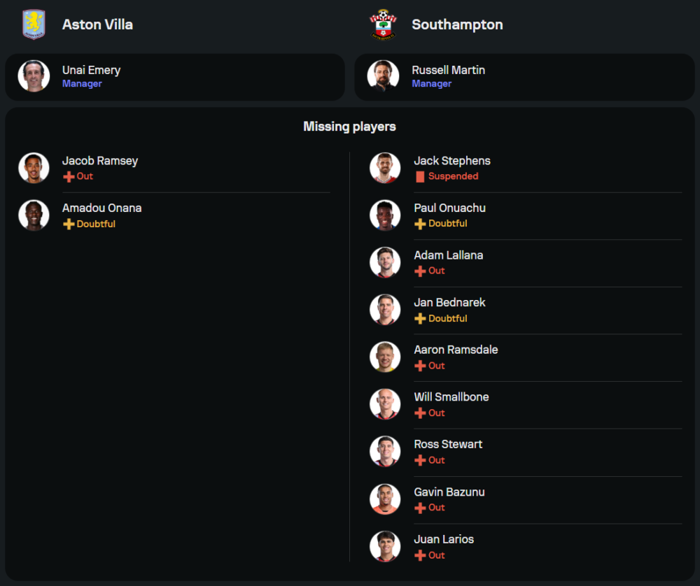 ทัพ “นักบุญ” ภายใต้การคุมทีมของ รัสเซลล์ มาร์ติน ยังคงต้องเร่งฟื้นฟอร์มหลังพ่ายเชลซีแบบยับเยิน 1-5 ในเกมล่าสุด ก่อนหน้านั้นแม้พวกเขาจะยันเสมอไบรท์ตัน 1-1 และสู้อย่างสูสีในเกมแพ้ลิเวอร์พูล 2-3 แต่ความไม่แน่นอนในแนวรับยังคงเป็นจุดอ่อนสำคัญ เกมเยือนก็ย่ำแย่ด้วยการชนะไม่ได้เลยจาก 7 นัด เสมอ 1 และแพ้ถึง 6 นัด ทำให้เกมนี้เป็นบททดสอบที่หนักหนาสำหรับพวกเขาอีกครั้ง