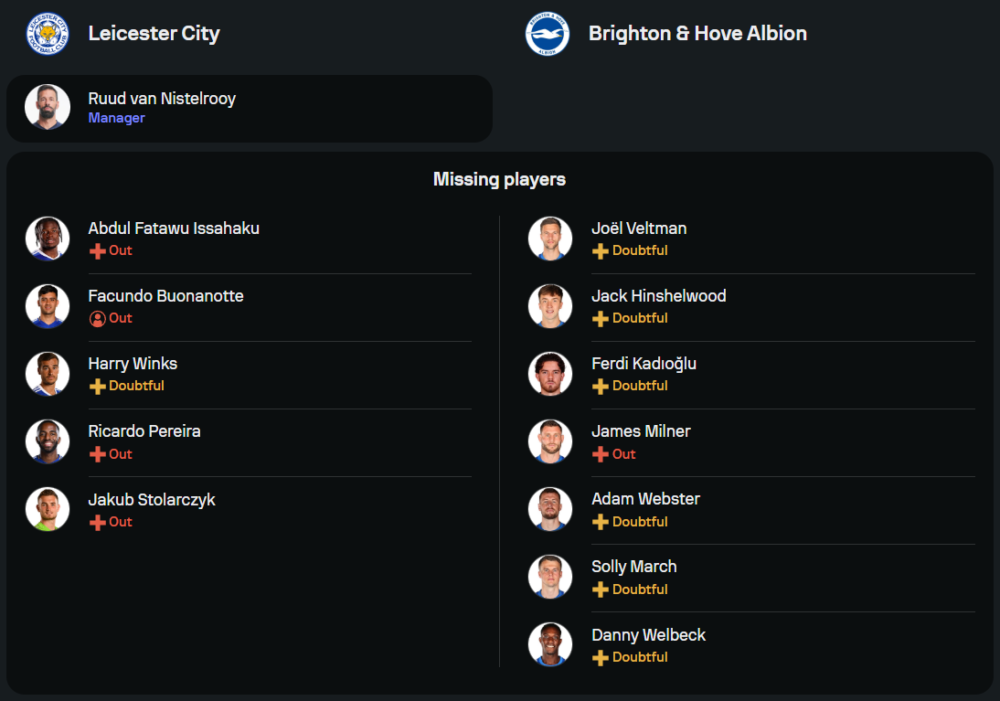 รุด ฟาน นิสเตลรอย กุนซือใหม่ของเลสเตอร์ กำลังได้รับการจับตามองหลังพาทีมเอาชนะเวสต์แฮม 3-1 ในเกมล่าสุด สำหรับเกมนี้ ทีมยังต้องปรับตัวในแดนหน้าเนื่องจาก ฟาคุนโด้ บัวนาน็อตเต้ ไม่สามารถลงเล่นได้ตามเงื่อนไขยืมตัว ทำให้ สเตฟี่ มาวิดิดี้ จะได้ลงมาเสริมเกมรุก โดยมี เจมี่ วาร์ดี้ เป็นหน้าเป้าตัวหลักในระบบ 4-2-3-1 อย่างไรก็ตาม ทีมยังไม่มีข่าวดีเรื่องการฟื้นตัวของ แฮร์รี่ วิงค์ส, ริคาร์โด้ เปเรยร่า และ อับดุล ฟาตาวู ที่ยังต้องพักยาว