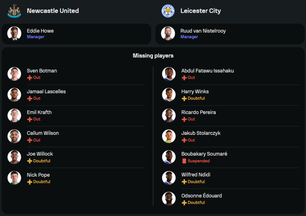 กุนซือ เอ็ดดี้ ฮาว ต้องเจอปัญหาผู้เล่นตัวหลักบาดเจ็บหลายราย เช่น จามาล ลาสเซลล์ส และ คัลลั่ม วิลสัน แต่ยังคงมีความหวังในแนวรุกจาก แอนโธนี่ กอร์ดอน และ อเล็กซานเดอร์ อิซัค ที่พร้อมล่าสกอร์ในระบบ 4-3-3 โดยมี บรูโน่ กีมาไรส์ คอยคุมเกมจากแดนกลาง