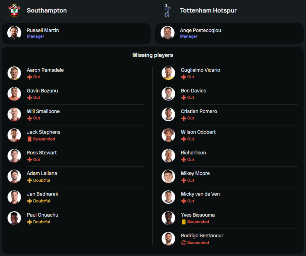 อังเก้ ปอสเตโคกลู กุนซือของสเปอร์ส ต้องเผชิญกับความท้าทายในการจัดทีม เนื่องจากขาดผู้เล่นตัวหลักหลายคนจากอาการบาดเจ็บและติดโทษแบน เช่น โรดริโก้ เบนตานกูร์ และ อีฟส์ บิสซูม่า แนวรุกยังคงฝากความหวังไว้กับ ซอน ฮึง-มิน, โดมินิก โซลันกี้ และ เบรนแน่น จอห์นสัน ในระบบ 4-3-3 ที่เน้นเกมบุกเป็นหลัก