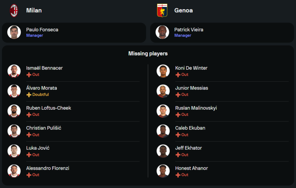 ลูกทีมของ เปาโล ฟอนเซกา เจอปัญหาอาการบาดเจ็บเล่นงานหลายตำแหน่ง โดยเฉพาะในเกมรุกที่ขาด คริสเตียน ปูลิซิช และ อัลบาโร่ โมราต้า ทำให้ภาระตกอยู่ที่ ราฟาเอล เลเอา และ แท็มมี่ อบราฮัม ซึ่งยังต้องพิสูจน์ตัวเองอีกมาก การจัดทีมในระบบ 4-2-3-1 คาดว่าจะเน้นเกมรุกผ่านการสนับสนุนจากแดนกลางอย่าง ยูนุส มูซาห์ และ ซามูเอล ชุควูเอเซ่
