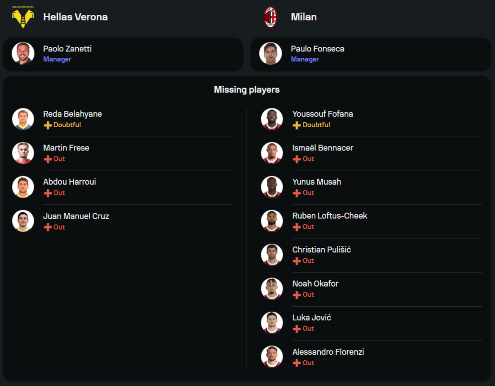 ทีมเยือน ปีศาจแดง-ดำ ภายใต้การนำของ เปาโล ฟอนเซกา กำลังเผชิญปัญหาผู้เล่นบาดเจ็บหลายราย เช่น โนอาห์ โอคาฟอร์ และ คริสเตียน ปูลิซิช ขณะที่ เตโอ แอร์กน็องเดซ แบ็คซ้ายคนสำคัญอาจต้องเริ่มต้นบนม้านั่งสำรอง อย่างไรก็ตาม พวกเขายังมี ราฟาเอล เลเอา และ แท็มมี่ อบราฮัม ที่พร้อมนำเกมรุกในระบบ 4-2-3-1 ซึ่งมุ่งหวังจะเก็บสามแต้มสำคัญในนัดนี้