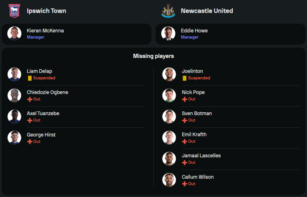 เอ็ดดี้ ฮาว จะต้องขาด โชเอลินตอน และผู้เล่นสำคัญอย่าง คัลลั่ม วิลสัน และ นิ๊ค โป๊ป ที่ยังบาดเจ็บ แต่ทีมยังคงเต็มไปด้วยตัวเลือกคุณภาพอย่าง อเล็กซานเดอร์ อิซัค และ แอนโธนี่ กอร์ดอน พร้อมสร้างสรรค์เกมรุก โดยมี จาค็อบ เมอร์ฟี่ เสริมความอันตรายในการเจาะแนวรับคู่แข่ง