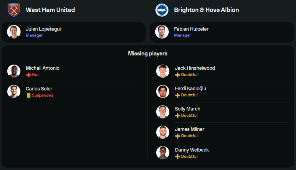 เวสต์แฮม ภายใต้การคุมทีมของ ฆูเลน โลเปเตกี กำลังพยายามกลับสู่ฟอร์มที่ดีที่สุด แม้จะเพิ่งเสมอกับ บอร์นมัธ 1-1 ในนัดล่าสุด แต่การเล่นในบ้านยังถือว่าแข็งแกร่ง อย่างไรก็ตาม พวกเขาจะขาด การ์ลอส โซเลร์ ที่ติดโทษแบน และ มิคาอิล อันโตนิโอ ที่ยังบาดเจ็บยาว คาดว่า จาร์ร็อด โบเว่น จะเป็นตัวหลักในเกมรุก ร่วมด้วย ลูคัส ปาเกต้า และ โมฮัมเหม็ด คูดุส