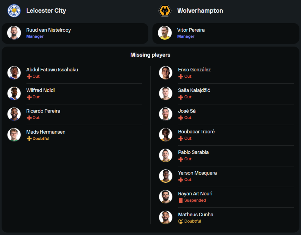 ฝั่งเจ้าบ้าน เลสเตอร์ ซิตี้ ภายใต้การคุมทัพของ รุด ฟาน นิสเตลรอย ยังคงมีปัญหาผู้เล่นบาดเจ็บหลายราย ทั้ง อับดุล ฟาตาวู, วิลเฟร็ด เอ็นดิดี้ และ ริคาร์โด้ เปไรร่า แต่ยังมีตัวเก๋าอย่าง เจมี่ วาร์ดี้ นำทีมในแดนหน้า พร้อมด้วยสามประสานอย่าง เคซี่ย์ แม็กอาเทียร์, ฟากุนโด บูโอนาน็อตเต้ และ บิลาล เอล คานนูสส์ ที่พร้อมสนับสนุนเกมรุกเต็มกำลัง