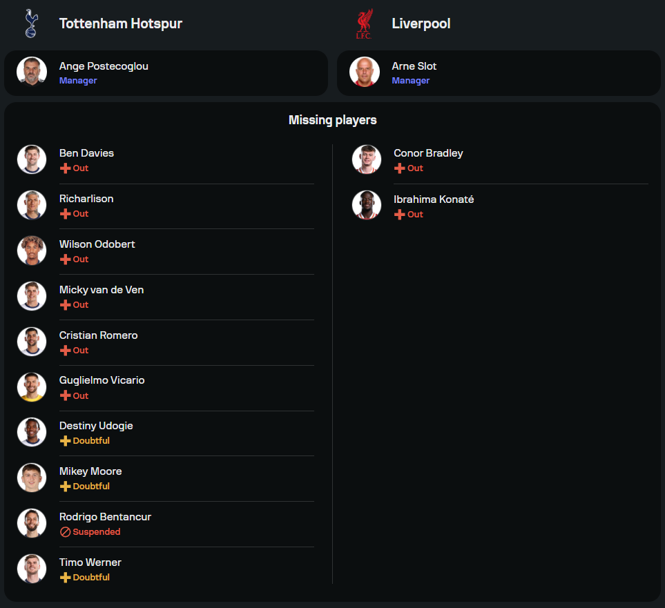 ฝั่งเจ้าบ้านภายใต้การนำของ อังเก้ ปอสเตโคกลู กำลังอยู่ในช่วงฟอร์มดีสุดขีด หลังจากเอาชนะแมนเชสเตอร์ ยูไนเต็ดในเกมลีกคัพ 4-3 แต่ปัญหาหลักของพวกเขาคือการขาดผู้เล่นตัวหลักหลายราย ทั้ง โรดริโก้ เบนตานกูร์, คริสเตียน โรเมโร่ และ ริชาร์ลิซอน อย่างไรก็ตาม ตัวรุกอย่าง ซอน ฮึง-มิน และ โดมินิก โซลันกี้ ยังพร้อมล่าตาข่ายในแดนหน้า โดยมี เบรนแน่น จอห์นสัน ช่วยสนับสนุนอย่างเต็มกำลัง