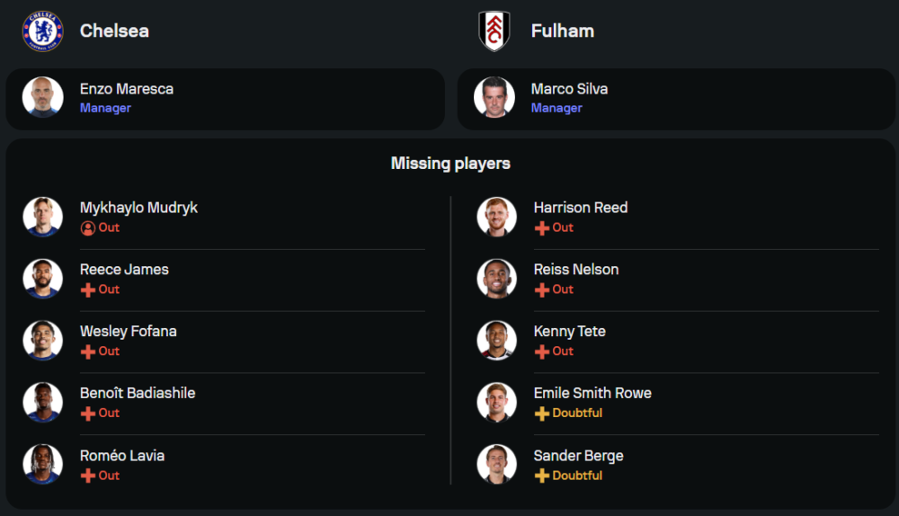ลูกทีมของ วินเซนโซ่ มาเรสก้า ยังมีปัญหาผู้เล่นบาดเจ็บและติดโทษแบน ทั้ง มีไคโล มูดริค, มาร์ก กูกูเรญ่า, และ รีซ เจมส์ ที่ยังไม่พร้อมลงสนาม อย่างไรก็ตาม แนวรุกยังคงหวังพึ่ง นิโคลัส แจ็คสัน พร้อมด้วยสามประสาน โนนี่ มาดูเอเก้, โคล พัลเมอร์, และ เจดอน ซานโช่ ที่พร้อมสร้างโอกาสทำประตูในระบบ 4-2-3-1