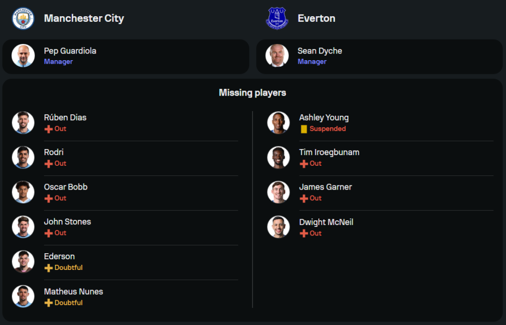 ทีมของ ฌอน ไดช์ แม้จะเก็บผลเสมอในสองเกมหลังสุดกับทีมใหญ่อย่าง อาร์เซน่อล และ เชลซี แต่ความพร้อมคืนนี้ยังคงขาดผู้เล่นตัวหลักอย่าง ดไวจ์ท แม็กนีล และ เจมส์ การ์เนอร์ อย่างไรก็ตาม โดมินิก คัลเวิร์ต-เลวิน จะยังคงเป็นความหวังสูงสุดในแนวรุก ขณะที่แดนกลางมี อับดูลาย ดูกูเร่ คอยสร้างสรรค์เกม