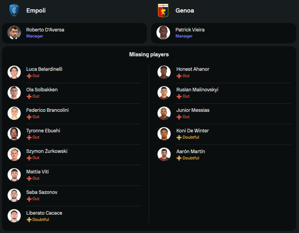 ลูกทีมของ โรแบร์โต้ ดาแวร์ซ่า เจอปัญหาฟอร์มตกอย่างหนักหลังแพ้รวด 2 เกมติดต่อกัน แม้จะได้ มัตเตีย เด ชิโญ่ กลับมาจากโทษแบน แต่การขาดนักเตะตัวหลักหลายราย ทั้ง มัตเตีย วิติ และ ไทโรน เอบูฮี ยังเป็นปัญหาใหญ่ การปรับเกมรุกด้วยการใช้ เซบาสเตียโน่ เอสโปซิโต้ และ ยูสเซฟ มาเลห์ คอยสนับสนุน ลอเรนโซ่ โคลอมโบ ในตำแหน่งหน้าเป้า อาจช่วยเพิ่มประสิทธิภาพในเกมนี้