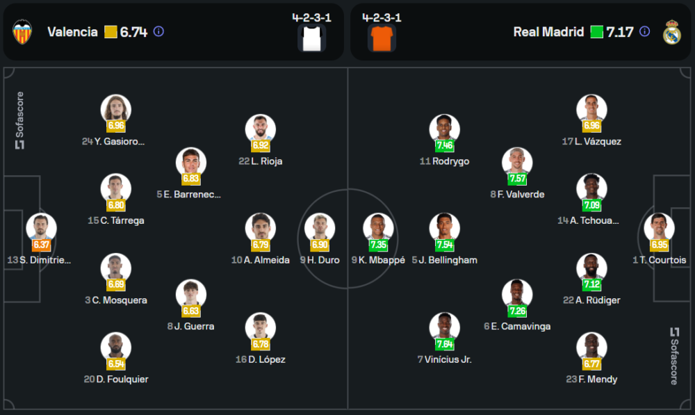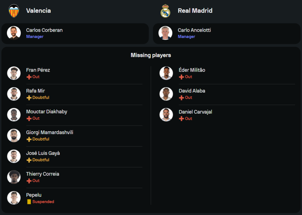 ฟอร์มของราชันชุดขาวกำลังร้อนแรง หลังจากชนะถึง 4 จาก 5 เกมล่าสุด และมีแต้มตามหลังจ่าฝูงเพียงคะแนนเดียว พวกเขาจะได้ วินิซิอุส จูเนียร์ กลับมาจากโทษแบนเพื่อเสริมแนวรุก ส่วนตำแหน่งอื่น ๆ ยังคงเป็นผู้เล่นตัวหลักอย่าง คิเลียน เอ็มบัปเป้ และ จู๊ด เบลลิ่งแฮม ที่พร้อมลงสนาม การขาดหายไปของ เอแดร์ มิลิเตา และ ดานี่ การบาฆาล อาจเป็นปัญหาเล็กน้อยในแนวรับ แต่ด้วยความแกร่งของ อันโตนิโอ รูดิเกอร์ และ เอดูอาร์โด้ คามาวิงก้า พวกเขายังคงได้เปรียบ