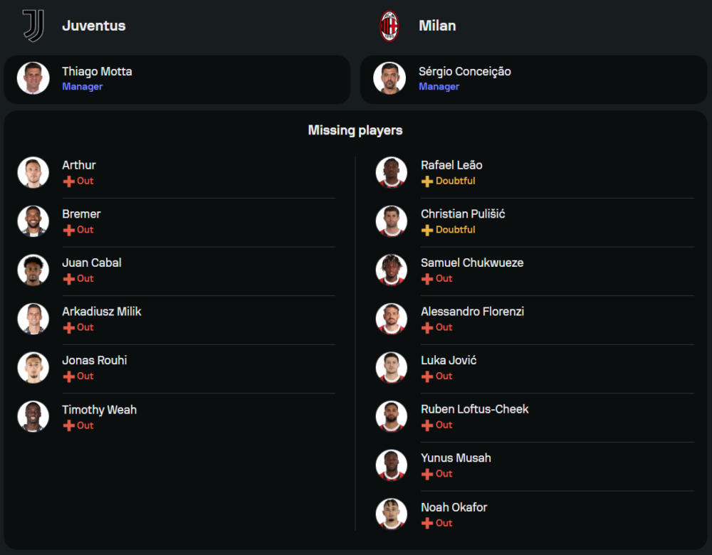ทางฝั่ง “ปีศาจแดง-ดำ” ที่เพิ่งแต่งตั้ง แซร์โจ้ คอนไซเซา เป็นผู้จัดการทีมคนใหม่ มีปัญหาผู้เล่นบาดเจ็บหลายรายเช่นกัน ทั้ง รูเบน ลอฟตัส-ชี๊ค และ ยูนุส มูซาห์ ที่ไม่พร้อมลงสนาม รวมถึง คริสเตียน ปูลิซิช และ ราฟาเอล เลเอา ที่ยังต้องเช็คความฟิต อย่างไรก็ตาม แนวรุกยังมี อัลบาโร่ โมราต้า และ แท็มมี่ อบราฮัม เป็นตัวหลักในเกมรุก
