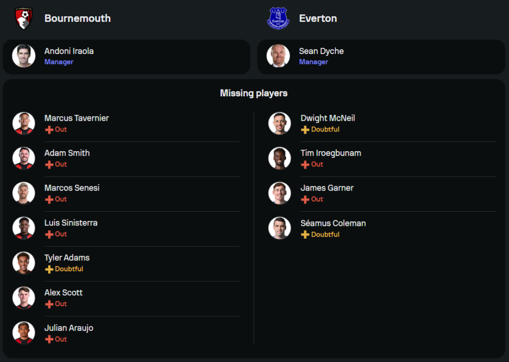ภายใต้การคุมทีมของ อันโดนี่ อิราโอล่า บอร์นมัธ ยังคงต้องแก้ปัญหาผู้เล่นบาดเจ็บหลายราย อาทิ มาร์กอส เซเนซี่ และ อเล็กซ์ สกอตต์ ที่ไม่สามารถลงช่วยทีมได้ คาดว่า อิราโอล่า จะยึดระบบ 4-2-3-1 โดยมี อีวานิลซอน เป็นกองหน้าตัวเป้าพร้อมการสนับสนุนจาก จัสติน ไคลเวิร์ต ในตำแหน่งเพลย์เมคเกอร์