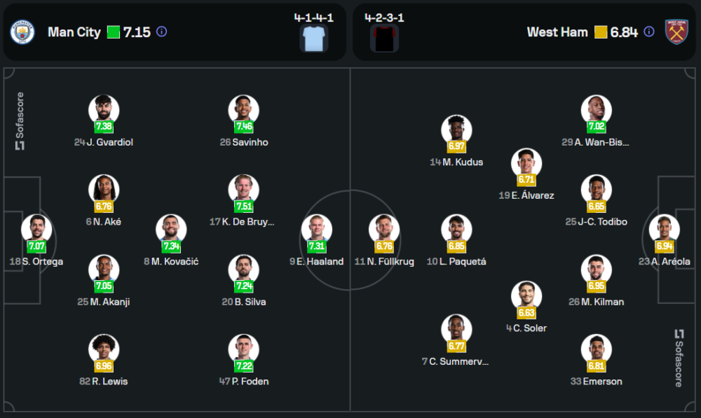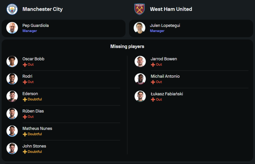 แมนเชสเตอร์ ซิตี้ ลูกทีมของ เป๊ป กวาร์ดิโอล่า กำลังได้รับแรงกระตุ้นหลังเอาชนะเลสเตอร์ไป 2-0 สัปดาห์ก่อน แต่ทีมยังคงมีปัญหาผู้เล่นบาดเจ็บอย่าง รูเบน ดิอาส, จอห์น สโตนส์, และ โรดริโก้ เอร์นานเดซ ที่ยังไม่พร้อมลงสนาม ขุมกำลังหลักอย่าง เออร์ลิ่ง ฮาลันด์, เควิน เดอ บรอยน์, และ แบร์นาร์โด้ ซิลวา พร้อมลงสนามในระบบ 4-1-4-1