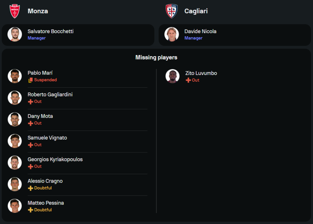 เจ้าบ้านภายใต้การนำของ ซัลวาตอเร่ บ็อกเค็ตติ ยังไม่สามารถหยุดความย่ำแย่ได้ หลังพ่ายแพ้ในลีกต่อเนื่องถึง 10 นัดรวด แถมยังเสียผู้เล่นสำคัญอย่าง ปาโบล มารี่ ที่ติดโทษแบน และยังมีผู้เล่นหลายรายที่บาดเจ็บ อาทิ ดานี่ โมต้า และ จอร์จอส คีเรียโคปูลอส การจัดทีมในเกมนี้จึงน่าสนใจว่า บ็อกเค็ตติ จะปรับแผนการเล่นในระบบ 3-4-2-1 เพื่อเน้นเกมรับและใช้ ดาเนี่ยล มัลดินี่ เป็นความหวังในแนวรุก