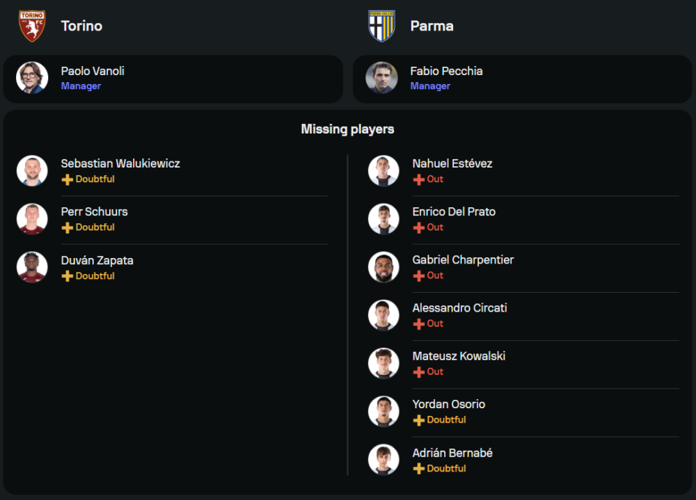 ในอีกฝั่ง ฟาบิโอ เป็คเคีย ต้องเผชิญกับปัญหาตัวผู้เล่นเช่นกัน โดยขาดกัปตันทีม เอ็นรีโก้ เดล ปราโต้ และมิดฟิลด์คนสำคัญอย่าง เอร์นานี่ แผงรุกจะพึ่งพาความเร็วของ เดนนิส มัน และความเฉียบคมของ โยอัน บอนนี่ ซึ่งเป็นตัวความหวังในการเจาะแนวรับของโตริโน่