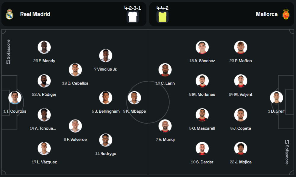 เรอัล มาดริด: ทีมแชมป์เก่าเข้าสนามพร้อมความมั่นใจเต็มเปี่ยม แต่ยังคงขาดนักเตะสำคัญอย่าง เฆซุส บาเยโฆ่ และ เอแดร์ มิลิเตา ที่ยังบาดเจ็บ ขณะที่ ติโบ กูร์กตัวส์ ผู้รักษาประตูมือหนึ่งกลับมาประจำตำแหน่ง ชุดใหญ่ถูกจัดเต็มภายใต้ระบบ 4-3-1-2 โดยมี จู๊ด เบลลิ่งแฮม รับบทเพลย์เมกเกอร์และ คิเลียน เอ็มบัปเป้ เป็นหัวหอกตัวเป้า