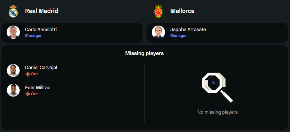 มายอร์ก้า: ฝั่งทีมเยือนต้องรอลุ้นความฟิตของ อันโตนิโอ ราอิโญ่ แนวรับตัวหลัก และ อันโตนิโอ ซานเชซ กองกลางคนสำคัญ แต่ยังมีความหวังในเกมรุกจากคู่หัวหอก ไคล์ ลาริน และ เวดัต มูริกี ที่พร้อมลุยตามแผน 4-4-2 แม้ชื่อชั้นจะเป็นรอง แต่เกมนี้พวกเขาไม่มีอะไรจะเสีย