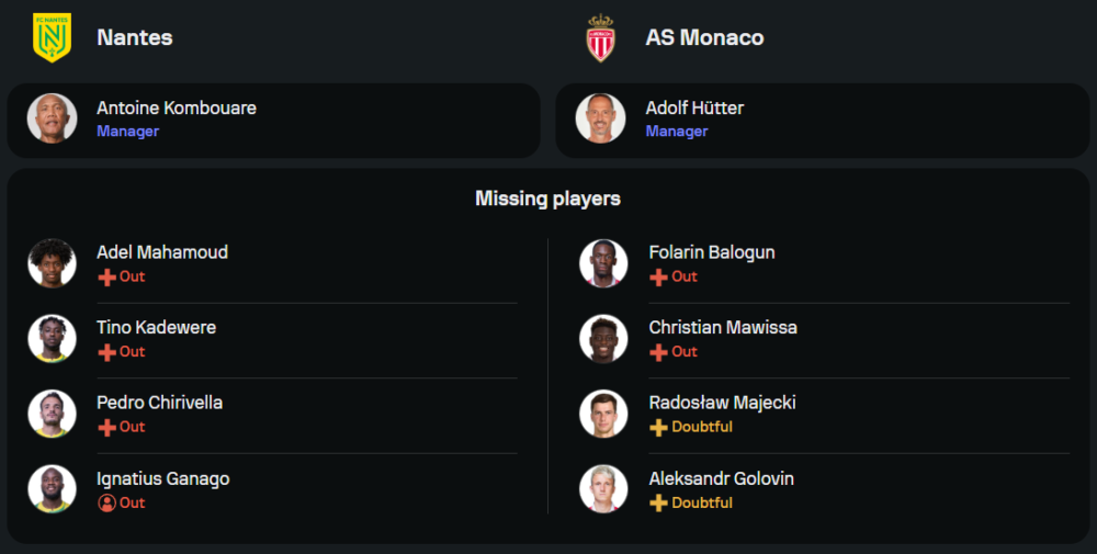 ด้านทีมเยือน โมนาโก ภายใต้การนำของ อาดี้ ฮึทเทอร์ ยังคงเผชิญกับปัญหาผู้เล่นเจ็บและติดโทษแบน เช่น คริสเตียน มาวิสซ่า และ โฟลาริน บาโลกุน แต่ตัวหลักอย่าง บรีล เอ็มโบโล่ และ เอลิสเซ่ เบนเซกีร์ พร้อมลงสนามในเกมนี้ คาดว่าโมนาโกจะมาในระบบ 4-2-3-1 โดยมี บรีล เอ็มโบโล่ เป็นหัวหอกตัวเป้า