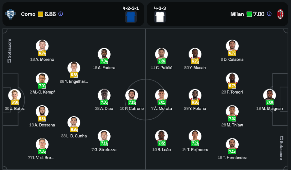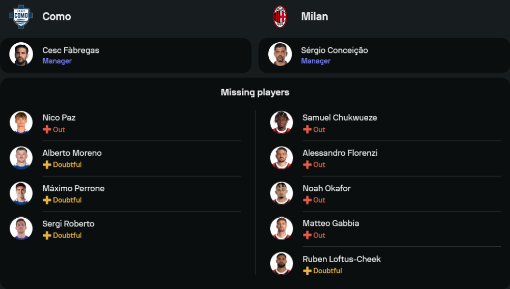ทีมเยือนอย่าง เอซี มิลาน ภายใต้การนำของ แซร์โจ้ คอนไซเซา จะไม่มีชื่อของ อเลสซานโดร ฟลอเรนซี่ และ ซามูเอล ชุควูเอเซ่ ที่ยังมีปัญหาอาการบาดเจ็บ อย่างไรก็ตาม แกนหลักของทีมยังคงพร้อม ไม่ว่าจะเป็น ราฟาเอล เลเอา, คริสเตียน พูลิซิช และ อัลบาโร่ โมราต้า ที่ยังคงเป็นความหวังในเกมรุก มิลานจะมาในระบบ 4-2-3-1 เช่นเดียวกัน โดยเน้นการโจมตีจากแนวรุกที่มีความเร็วและความเฉียบคม