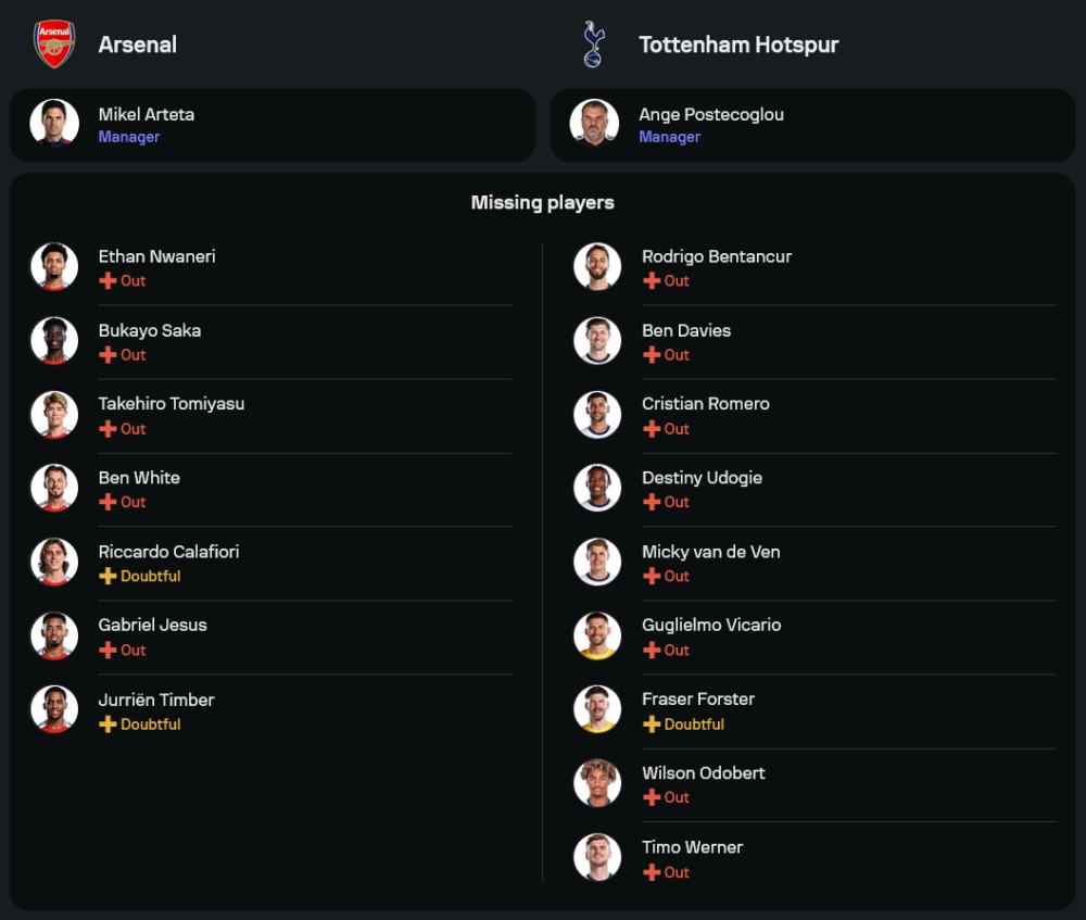 ฝั่งของ อังเก้ ปอสเตโคกลู เพิ่งพาทีมเอาชนะ แทมเวิร์ธ 3-0 ในเอฟเอ คัพ แม้ว่าทีมจะมีผู้เล่นบาดเจ็บหลายราย ทั้ง โรดริโก้ เบนตานกูร์, มิคกี้ ฟาน เด เฟ่น, และ คริสเตียน โรเมโร่ แต่พวกเขายังคงมีตัวเลือกสำคัญอย่าง ซอน ฮึง-มิน, เจมส์ แมดดิสัน, และ เดยาน คูลูเซฟสกี้ คาดว่าสเปอร์สจะมาในระบบ 4-3-3 เน้นเกมโต้กลับเร็ว