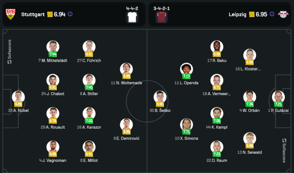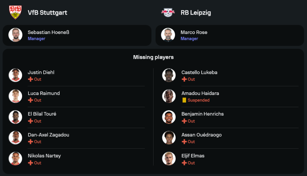 แอร์เบ ไลป์ซิก: ทีมเยือนของกุนซือ มาร์โก โรเซ่ เพิ่งจะโชว์ฟอร์มโหดในเกมเหย้าล่าสุดที่เอาชนะเบรเมนไป 4-2 อย่างไรก็ตาม ฟอร์มนอกบ้านยังไม่ค่อยแน่นอนเท่าที่ควร และต้องขาด อมาดู ไฮดาร่า ที่ติดโทษแบน รวมถึงผู้เล่นบาดเจ็บอีกหลายราย แต่ยังมีตัวรุกอย่าง ลูอิส โอเปนด้า และ เบนยามิน เชสโก้ ที่ฟอร์มกำลังร้อนแรงเป็นทีเด็ดในแนวหน้า คาดว่าจะลงสนามในระบบ 3-4-1-2 เพื่อเน้นเกมสวนกลับ