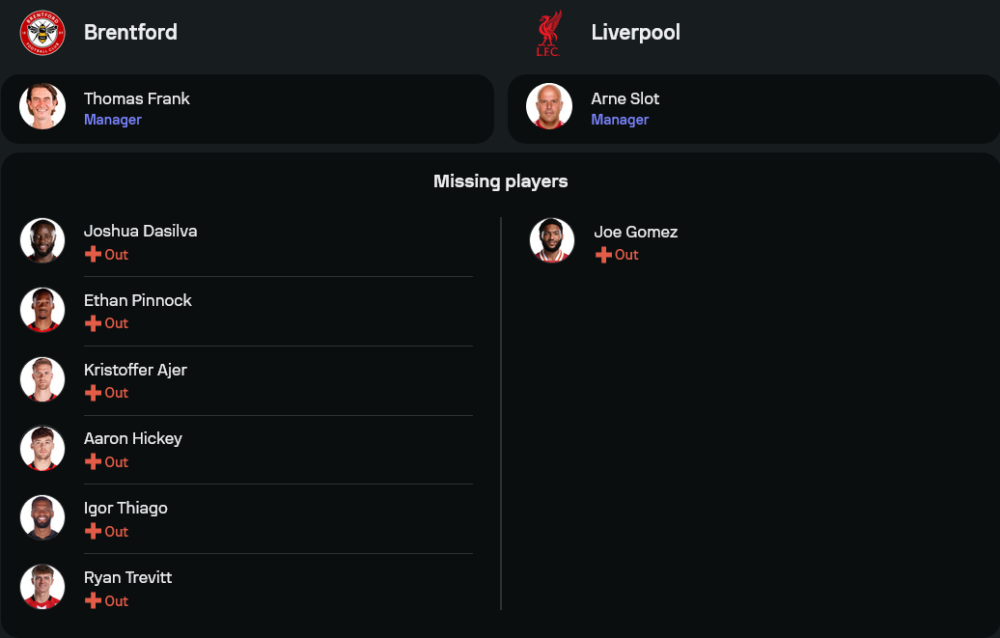 กุนซือคนใหม่ อาร์เน่ สล็อต จะไม่มี โจ โกเมซ ที่ยังบาดเจ็บ แต่ขุมกำลังหลักรายอื่นยังอยู่กันครบ ไม่ว่าจะเป็น โมฮาเหม็ด ซาล่าห์, ดาร์วิน นูนเญซ และ โคดี้ กัคโป ที่พร้อมลงสนามในแผน 4-2-3-1 ซึ่งยังคงเป็นระบบที่ทำให้พวกเขารั้งตำแหน่งจ่าฝูง