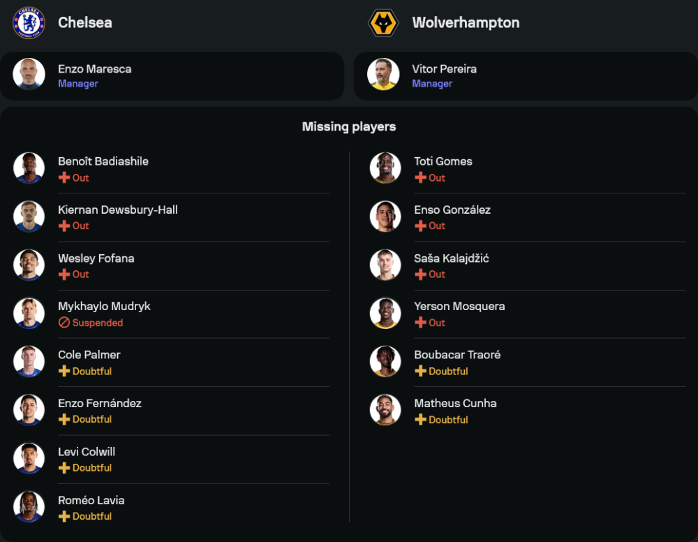 ทีมของ เอนโซ่ มาเรสก้า ยังมีปัญหาผู้เล่นบาดเจ็บหลายราย นำโดย เบอนัวต์ บาเดียชิล, เวสลีย์ โฟฟาน่า และ เคียร์แนน ดิวส์บิวรี่-ฮอลล์ ส่วน มิคไฮโล มูดริค ติดโทษแบน ขณะที่ โคล พาลเมอร์, เอ็นโซ่ เฟร์นานเดซ และ เลวี่ โคลวิลล์ อยู่ในข่ายเช็คความฟิต เกมนี้เชลซียังคงยึดแผน 4-2-3-1 โดยมี โคล พาลเมอร์ เป็นเพลย์เมกเกอร์ปั้นเกมอยู่หลัง นิโคลัส แจ็คสัน