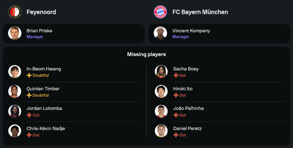 แมตช์นี้จะเป็นการพบกันครั้งแรกของ เฟเยนูร์ด และ บาเยิร์น มิวนิค บนเวทียูฟ่า แชมเปียนส์ลีก ซึ่งทำให้เป็นเกมที่น่าสนใจอย่างมาก เพราะทั้งสองทีมไม่มีข้อมูลการเจอกันมาก่อน ทำให้การวิเคราะห์เกมและการวางแผนแท็กติกจะเป็นเรื่องที่สำคัญสุดๆ