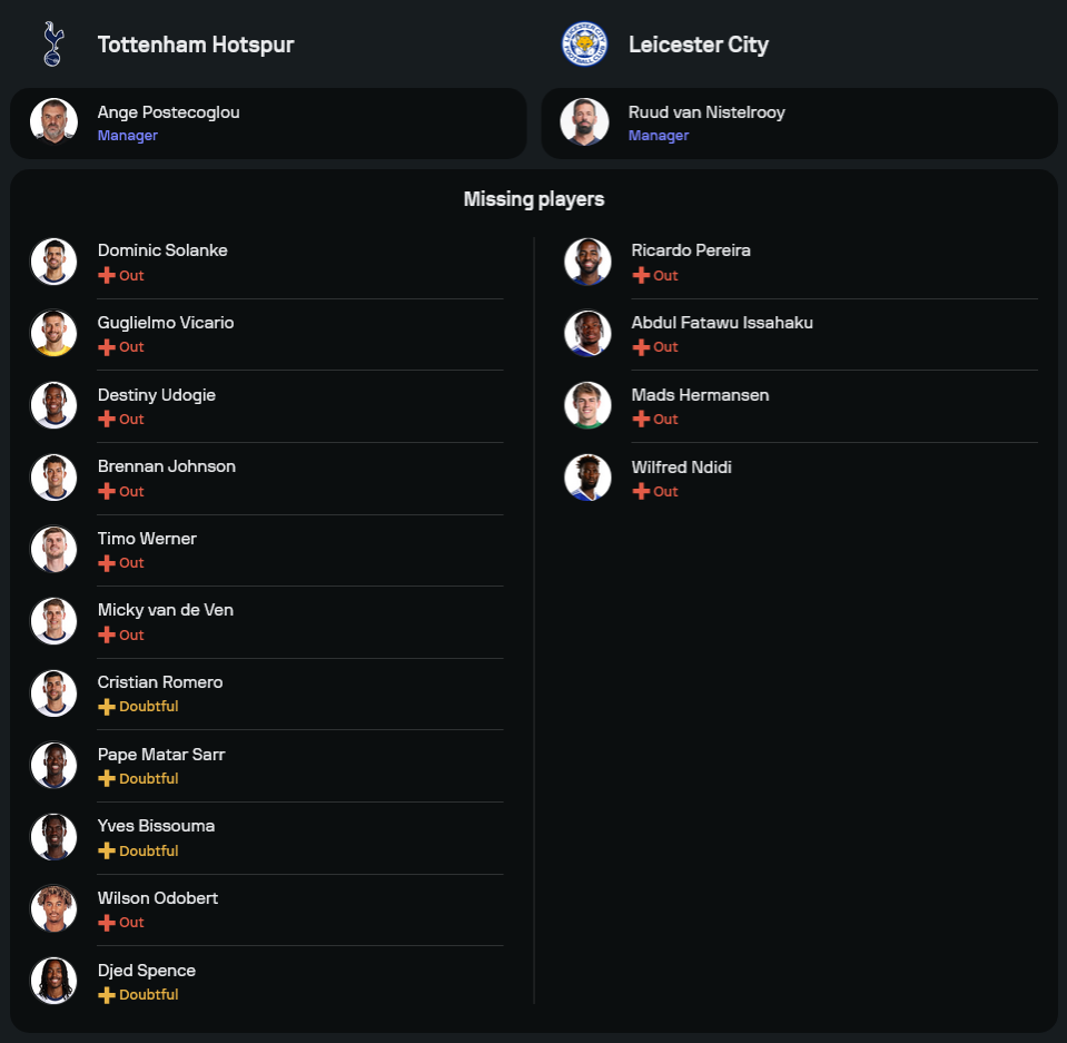 สภาพทีมถือว่าไม่สมบูรณ์นัก พวกเขาจะไม่มี วิลเฟร็ด เอ็นดิดี้, อับดุล ฟาตาวู, ริคาร์โด้ เปไรร่า และ แม็ดส์ เฮอร์มันเซ่น ที่ยังบาดเจ็บทั้งหมด อย่างไรก็ตาม แนวรุกยังพอมีตัวอันตรายอย่าง เจมี่ วาร์ดี้ และ บิลาล เอล คานนูสส์ ที่สามารถสร้างปัญหาให้กับแนวรับของสเปอร์สได้