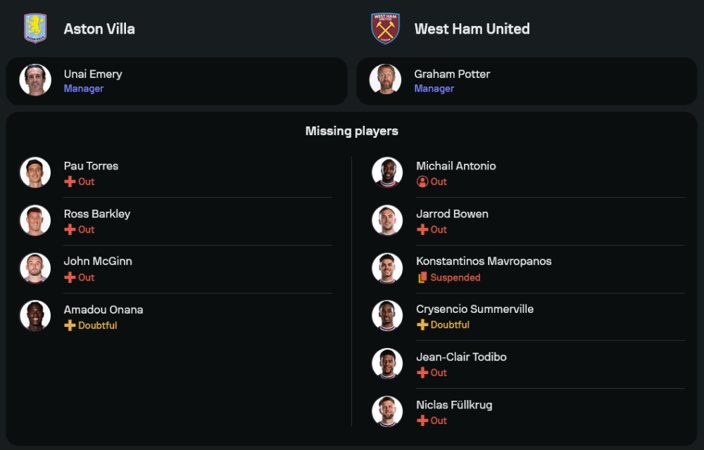 คอสแตนตินอส มาฟโรปานอส ติดโทษแบนแน่นอน เช่นเดียวกับ มิคาอิล อันโตนิโอ, จาร์ร็อด โบเว่น, ฌ็อง-แคลร์ โตดิโบ้ และ นิคลาส ฟูลล์ครู้ก ที่ยังบาดเจ็บทั้งหมด แกนหลักที่เหลือจะเป็น ลูคัส ปาเกต้า, โตมาส ซูเช็ค และ โมฮัมเหม็ด คูดุส ที่ต้องรับภาระหนัก