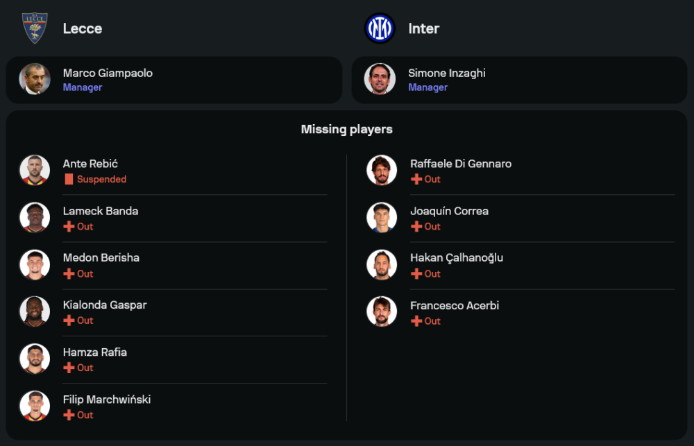 ทางฝั่ง อินเตอร์ มิลาน แม้จะขาดแข้งหลักบางราย เช่น ฮาคาน ชัลฮาโนกลู และ ฟรานเชสโก้ อแชร์บี้ ที่ยังไม่หายจากอาการบาดเจ็บ แต่ขุมกำลังที่เหลือยังคงแข็งแกร่ง โดยเฉพาะคู่หัวหอก เลาตาโร่ มาร์ติเนซ และ มาร์คุส ตูราม ที่ฟอร์มกำลังร้อนแรง นอกจากนี้ กองกลางอย่าง นิโคโล่ บาเรลล่า และ เฮนริค มคิตาร์ยาน พร้อมเป็นตัวขับเคลื่อนเกมรุกให้ทีมเยือนมาเก็บชัยออกไปได้อีกครั้ง