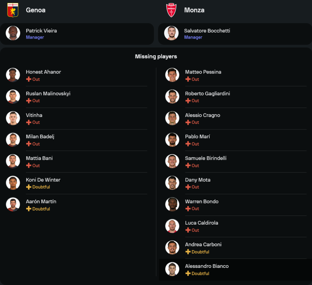 ลูกทีมของ ปาทริค วิเอร่า กำลังต้องการเรียกฟอร์มกลับมาให้เร็วที่สุด โดยใน 5 นัดหลังสุด พวกเขาชนะ 2 แพ้ 2 และเสมอ 1 สภาพทีมก่อนเกมไม่มีผู้เล่นโดนแบนเพิ่มเติม แต่ต้องเช็กฟิต มิลาน บาเดลจ์ กองกลางคนสำคัญที่มีอาการบาดเจ็บอยู่ แนวรุกยังคงฝากความหวังไว้ที่ อันเดรีย ปินามอนติ ดาวยิงตัวหลักที่ซัดไปแล้ว 6 ประตูในฤดูกาลนี้ พร้อมประสานงานกับ ฟาบิโอ มิเรตติ และ อเลสซานโดร ซาโนลี่
