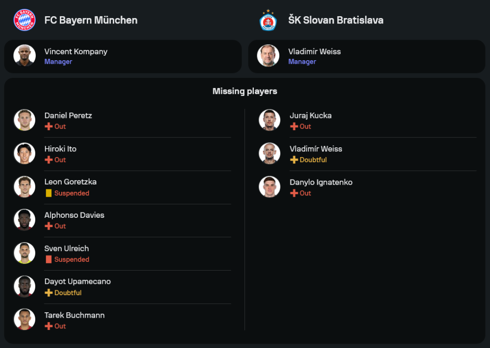 บาเยิร์น มิวนิค ของกุนซือ แว็งซ็องต์ กอมปานี มีปัญหาตัวผู้เล่นบาดเจ็บหลายราย โดย แดเนียล เปเร็ตซ์, ฮิโรกิ อิโตะ, อัลฟอนโซ่ เดวีส์ และ ทาเร็ค บุคมันน์ หมดสิทธิ์ลงสนามแน่นอน ขณะที่ ดาโยต์ อูปาเมกาโน่ ยังต้องรอเช็กความฟิต ด้าน เลออน โกเร็ตซ์ก้า และ สเวน อุลไรช์ ติดโทษแบนหมดสิทธิ์ช่วยทีม แต่ขุมกำลังหลักยังอยู่ครบ คาดว่ากอมปานีจะใช้ระบบ 4-2-3-1 โดยมี แฮร์รี่ เคน เป็นหน้าเป้า สนับสนุนโดย จามาล มูเซียล่า และ คิงส์ลีย์ โคมัน ส่วนแผงมิดฟิลด์มี โยชัว คิมมิช เป็นหัวใจสำคัญคุมเกม